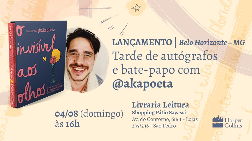 O lançamento de O invisível aos olhos e a sessão de autógrafos com @akapoeta será realizado no dia 4 de agosto, a partir das 16h, na Livraria Leitura do Shopping Pátio Savassi.